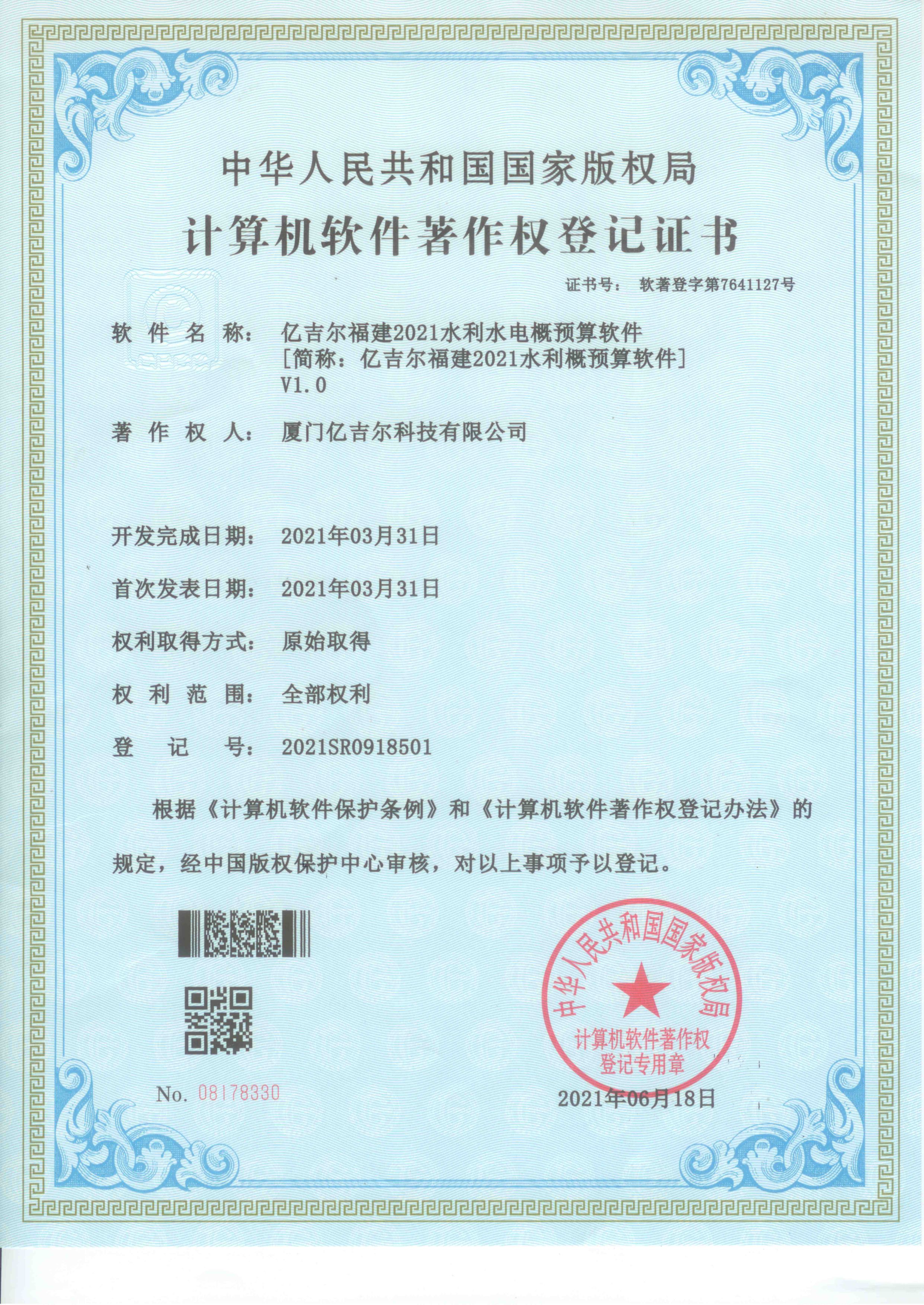 億吉爾福建2021水利水電概預(yù)算軟件著作權(quán)證書 發(fā)布日期:2023年11月22日 瀏覽次數(shù):2138 關(guān)鍵字: 公司 1/1億吉爾福建2021水利水電概預(yù)算軟件著作權(quán)證書
