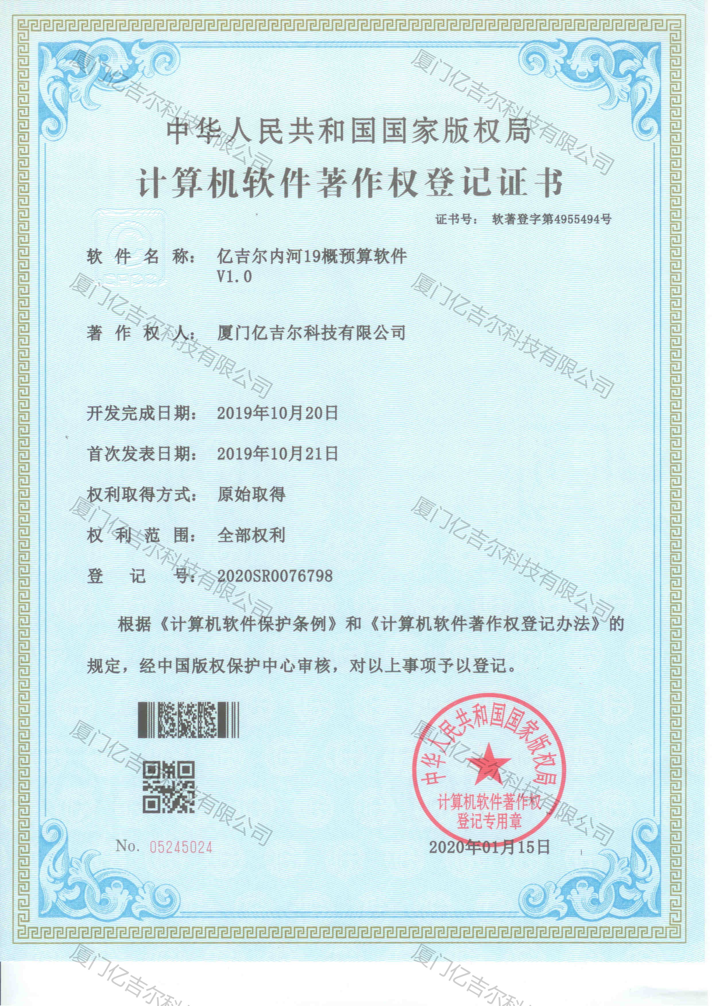 億吉爾內河19概預算軟件著作權登記證書