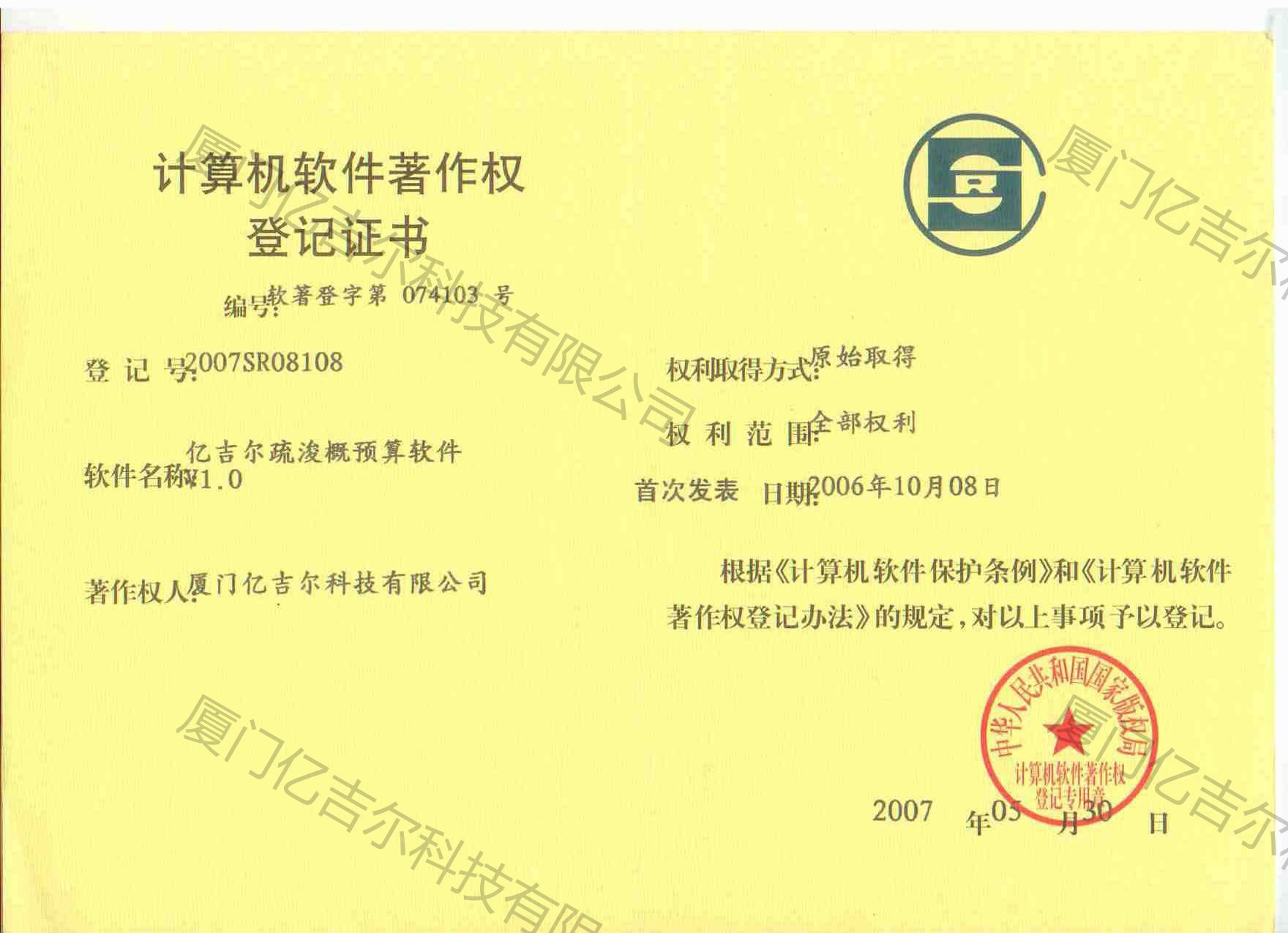 億吉爾疏浚概預(yù)算軟件著作權(quán)登記證書 發(fā)布日期:2007年05月30日 瀏覽次數(shù):3488 關(guān)鍵字: 公司 1/1億吉爾疏浚概預(yù)算軟件著作權(quán)登記證書